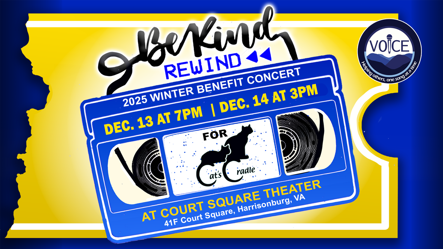 Previous concerts Rise Together in support of Friendly City Safe Space (Summer 2025) Ugly Sweater in support of Scholars Latino Initiative (Winter 2024) Music Heals in support of Blue Ridge Free Clinic (Summer 2024) A Winter Night’s Sky in support of Blue Ridge Foster Love (Winter 2023) Royal Flush in support of Still Meadows Enrichment Center and Camp (Summer 2023) Together As One in support of On the Road Collaborative (Winter 2022) Boogie Fever in support of Collins Center (Summer 2022) Peace on Earth in support of Skyline Literacy (Winter 2019) Music from Across the Pond in support of Open Doors (Summer 2019) Home for the Holidays in support of Our Community Place (Winter 2018) Songs of Hollywood in support of Second Home Learning Center(Summer 2018) Hilarity for the Holidazed in support of Special Olympics Area 4 (Winter 2017) VOICE 10 Year Anniversary in support of Valley Associates for Independent Living (Summer 2017) An A Cappella Concert in support of Valley Program for Aging Services (Winter 2016) Gone Country in support of Crossroads to Brain Injury Recovery (Summer 2016) A Gleeful Christmas in support of New Creation (Winter 2015) I Love the ‘80s in support of Camp LIGHT (Summer 2015) A Box Office Christmas in support of Collins Center (Winter 2014) I Love That Song! in support of Augusta Dog Adoptions (Summer 2014) The Ugly Christmas Sweater in support of The Salvation Army (Winter 2013) Name That Show on V-TV in support of Big Brothers Big Sisters (Summer 2013) Christmas Then & Now in support of Generations Crossing (Winter 2012) The Show Must Go On in support of American Cancer Society (Summer 2012) The Bi-Polar Express in support of Blue Ridge Area Food Bank (Winter 2011) The Music of Glee in support of Shenandoah Valley Autism Partnership (Summer 2011) VOICE at Christmas: A Capella in support of Blue Ridge Area Food Bank (Winter 2010) A Performance of VOICE Favorites! in support of Center for Marriage and Family Counseling (Summer 2010) VOICE at Christmas Presents: Agnus Dei & Christmas Favorites in support of Mercy House (Winter 2009) Be Kind, Rewind in support of Cat’s Cradle (Winter 2025) VOICE Fall Concert in support of Lupus Foundation of Virginia (Summer 2009) VOICE Performs a Musical Medley in support of American Cancer Society (Summer 2008)